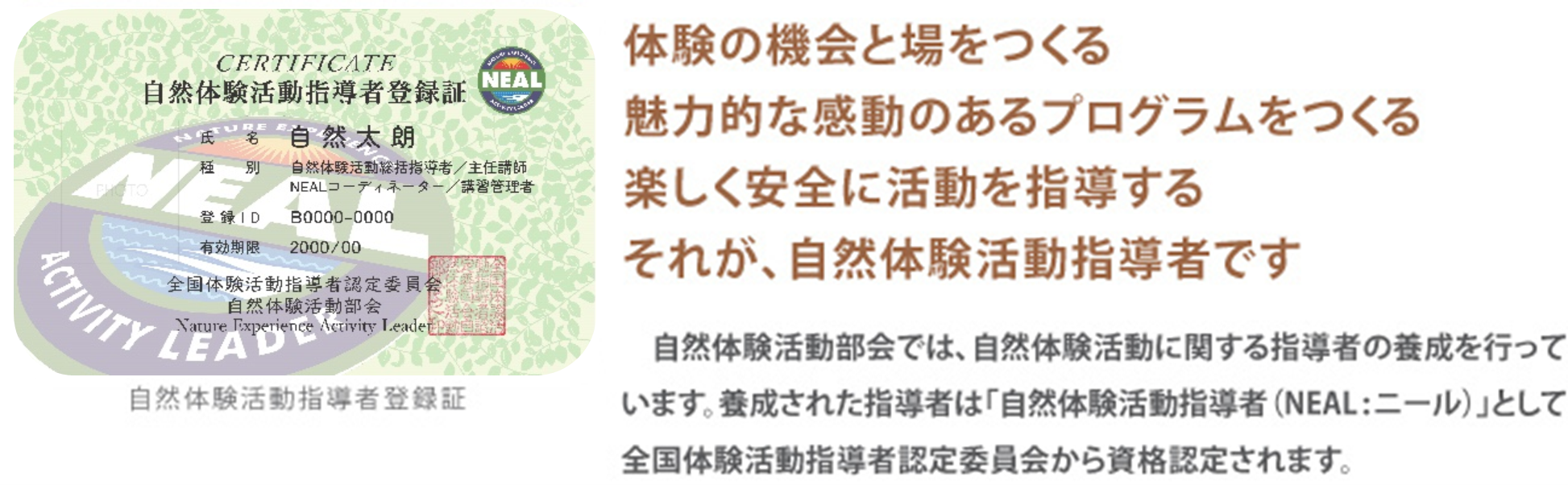 全国体験活動指導者認定委員会が設置し、主に養成団体や指導者資格の認定審査、自然体験活動指導者の登録、有資格者の活動促進等の業務を行います。